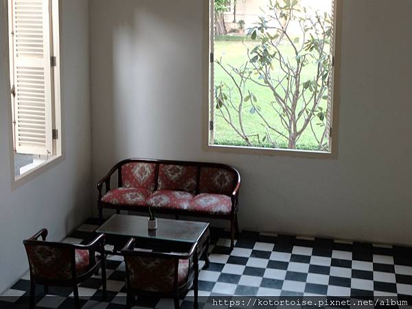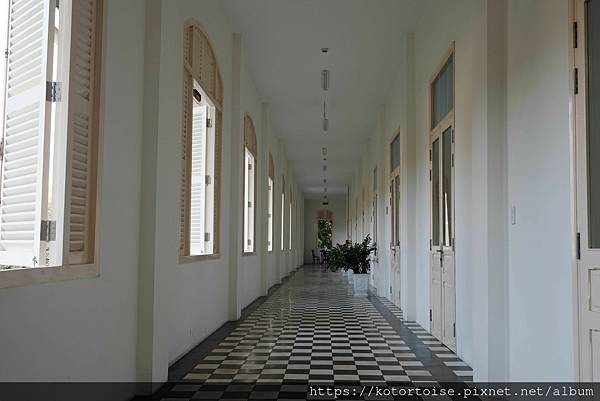 建築內黑白相間的廊道、半開的窗戶、老式座椅